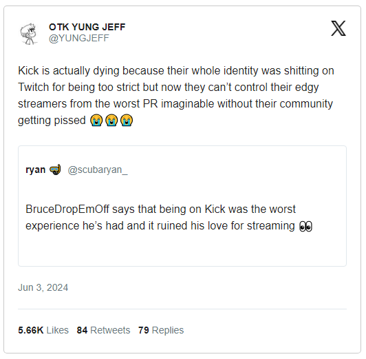 Last week, BruceDropEmOff returned to Twitch, a year after he became a marquee signing for Kick. This kickstarted (no pun intended) a debate on Twitter/X including the now-deleted post below.