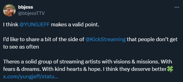bbjess provides the counterpoint though, stating that there are many Kick streamers “with kind hearts & hope”. And while Bruce has a valid point about the wild things happening on Kick, you don’t have to participate. Instead, you can enjoy the 95/5 sub split creating content you and your community enjoy.